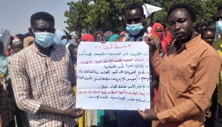 دخل اعتصام منطقة منواشي بمحلية مرشينج بولاية جنوب دارفور يومه الرابع احتجاجاً على مقتل 4 أشخاص على يد مسلحين يوم الأربعاء وحالة السيولة الأمنية في المنطقة.