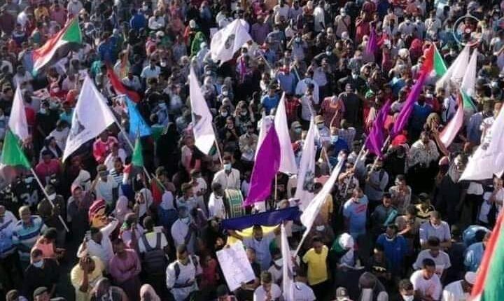 وشهدت ضاحية بحري- شمالي الخرطوم – أكبر المسيرات حيث احتش الآلاف من سكان أم درمان وشرق النيل في منطقة “المؤسسة” في وسط المدينة رافعين الإعلام والشعارات المطالبة بمدنية الدولة.