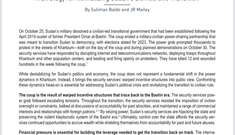 وأقترح مركز الشفافية الدولية عقوبات شخصية على قيادات الانقلاب الرئيسية عبد الفتاح البرهان القائد العام للجيش و محمد حمدان حميدتي قائد قوات الدعم السريع ، والقيام بإجراءات قانونية ضد  شركة الصناعات الحربية التابعة للقوات المسلحة والأنشطة الاقتصادية لأسرة محمد حمدان حميدتي .