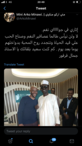 تفاعل رواد المنصات الاجتماعية  بتغريدة لرئيس حركة جيش تحرير السودان مني أركو مناوي علي حسابه الشخصي بتويتر حول لقائه بضابط أمن سابق بنظام البشير الذي تم اسقاطه بثورة شعبية  .