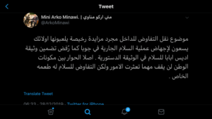 وأضاف مناوي في تغريدة على حسابه بـ (تويتر) اليوم السبت: “الحوار بين مكونات الوطن لن يقف مهما تعثرت الأمور ولكن التفاوض للسلام له طعمه الخاص”.