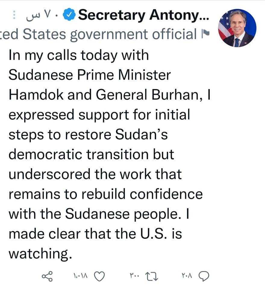 وقال بلينكن في تغريدة له علي ” تويتر ” أن الولايات المتحدة تراقب خطوات استعادت الديمقراطية  وعلي السلطة الانتقالية العمل علي اعادة بناء الثقة مع الشعب السودان .