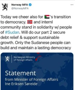 أعلنت النرويج، عن إلغاء جميع ديونها الثنائية مع السودان.