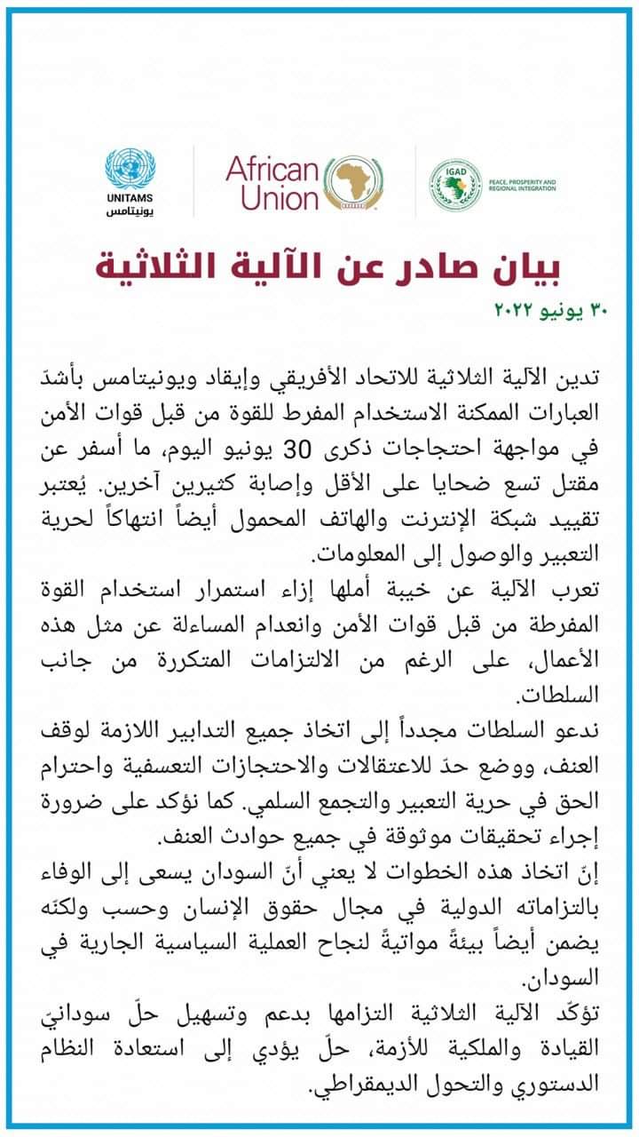 أدانت الآلية الثلاثية وإيقاد ويونيتامس، الاستخدام المفرط للقوة من قبل القوات الأمنية في مواجهة احتجاجات ذكرى الـ30 من يونيو، معربة عن خيبة أملها وانعدام المُساءلة عن الرغم من الالتزامات المتكررة منه جانب السلطات على حد تعبيرها.