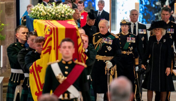 وشهد الملك تشارلز الثالث وزوجته الملكة القرينة كاميلا، وصول النعش إلى جانب أفراد آخرين من العائلة المالكة.