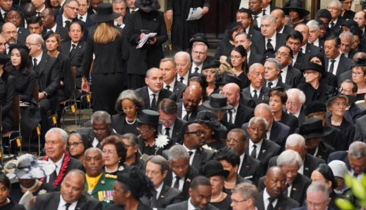 وتوافد زعماء العالم بمن فيهم الرئيس الأميركي جو بايدن، ورئيسة الوزراء البريطانية ليز تراس، والرئيس الفرنسي إيمانويل ماكرون، إضافة إلى رئيسة وزراء نيوزيلندا جاسيندا أرديرن، والملوك بما في ذلك الإمبراطور الياباني ناروهيتو والإمبراطورة ماساكو، وملك بلجيكا فيليب والملكة ماتيلد، وملك إسبانيا فيليب والملكة ليتيزيا، وملك السويد كارل السادس عشر غوستاف والملكة سيلفيا، وملك هولندا فيليم والملكة ماكسيما إلى الكنيسة في أسطول من الحافلات ابتداءً من الساعة الثامنة صباحاً.