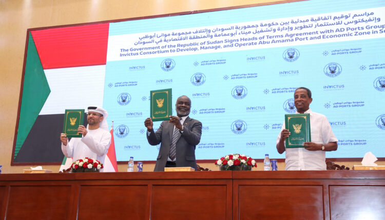 وقع السودان اليوم الثلاثاء، اتفاقا مبدئيا مع تحالف يضم شركة موانئ أبوظبي وشركة إنفيكتوس للاستثمار، لتطوير وإدارة وتشغيل ميناء أبو عمامة والمنطقة الاقتصادية على البحر الأحمر باستثمارات قيمتها ستة مليارات دولار.
