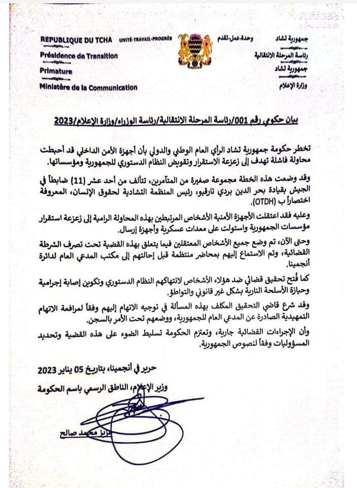 أعلنت الحكومة التشادية، مساء اليوم الخميس، عن إحباط محاولة انقلاب وصفتها ب”الفاشلة” واتهمت الضابط بحر الدين بردي تارفيو- الذي يترأس المنظمة التشادية لحقوق الإنسان -بقيادة مجموعة تضم 11 ضابطاً، عن تلك المحاولة.