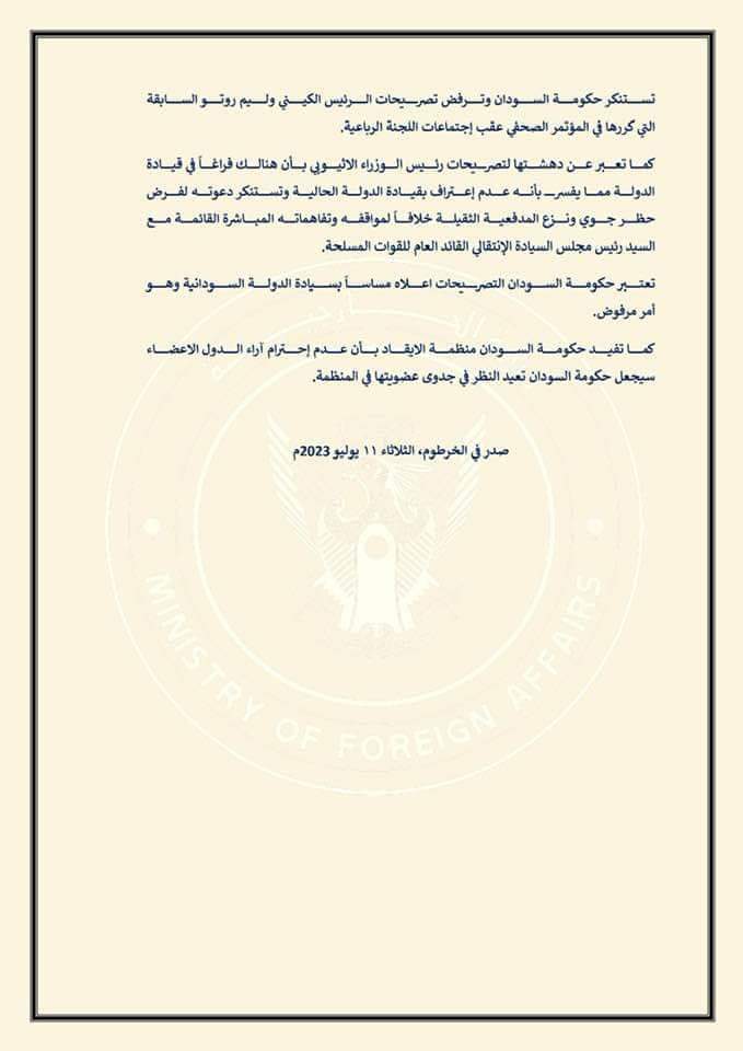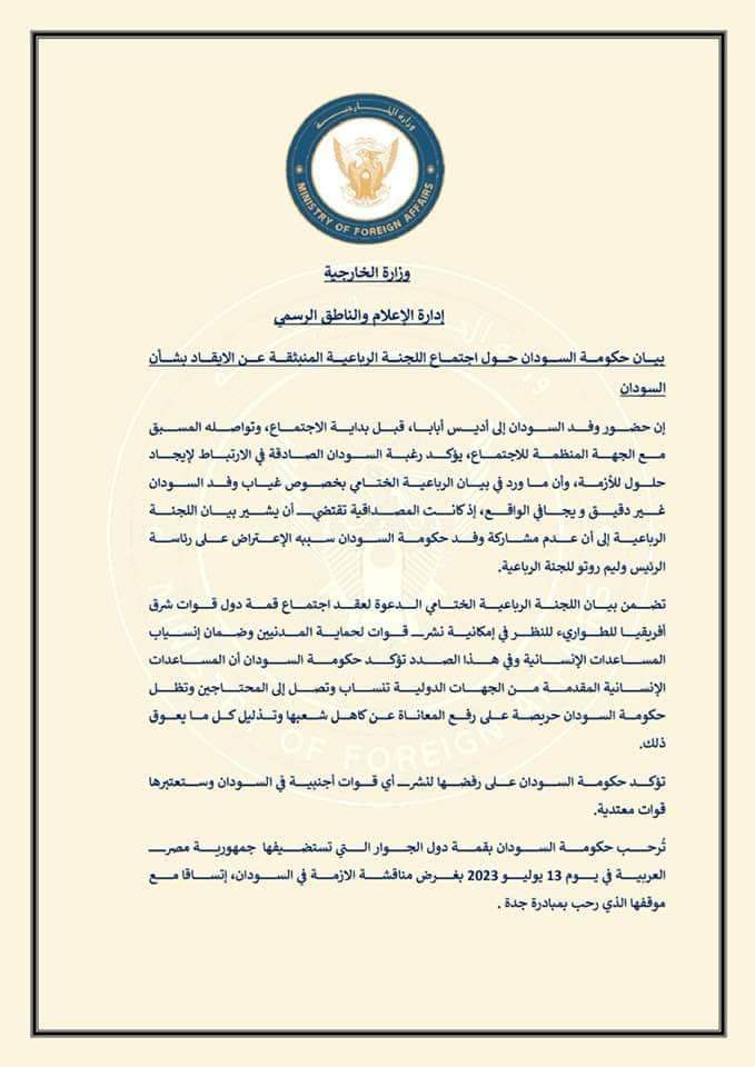 الخارجية السودانية: نرفض نشر قوات حفظ سلام علي أراضينا وسنعتبرها قوات معتدية أخبار آخر تحديث يوليو 11, 2023 مبني وزارة الخارجية السودانية بالخرطوم. 0 298 شارك الخرطوم _ السودان نت بيانات: الخارجية السودانية: نرفض نشر قوات حفظ سلام علي أراضينا وسنعتبرها قوات معتدية. #الإتحاد_الأوروبي#البرهان#السودان_نت#الفترة_الإنتقالية#حمدوكالجيش السودانيقوات الدعم السريع 0 298 شارك