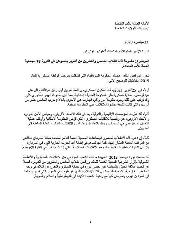 دفعت الحكومة الانتقالية السابقة في السودان برئاسة د. عبدالله آدم حمدوك، بمذكرة إلى الأمين العام للأمم المتحدة أنطونيو غوتيرش، احتجاجا على مشاركة القائد العام للجيش السوداني عبد الفتاح البرهان في أعمال الجمعية العامة للأمم المتحدة.