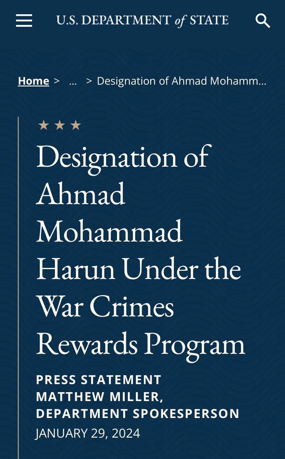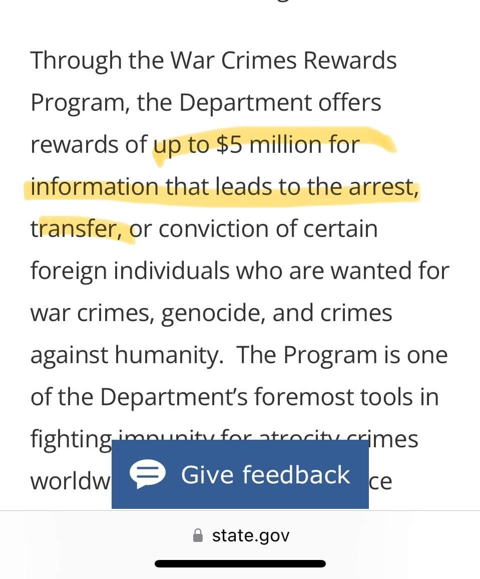 رصدت وزارة الخارجية الأمريكية 5 ملايين دولار، من النوع الأصلي لمن يدل على احمد هارون، ليتم تسليمه لمحكمة الجنايات الدولية، متهمة إياه “بالنص” برعاية مليشيا الجنجوي،د التي تحولت لاحقا الى الدعم السريع التي ارتكبت جرائم ضد الإنسانية. والجائزة ليست لمن يقبض عليه، بل فقط لمن يقدم معلومات تؤدي الى اعتقاله، وكانت أمريكا قد عرضت 25 مليون$ لمن يدلي بمعلومات تؤدي الى القبض على أسامة بن لادن، وربما فاز بالمكافأة باكستاني.